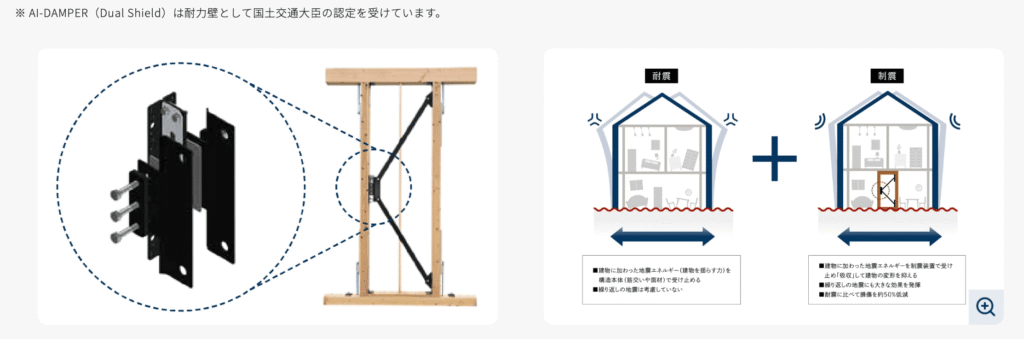 これまでは、制震ダンパーはオプション扱いだったんだけど、今回の新仕様からは、「AIダンパー Dual Shield」が全棟標準搭載!