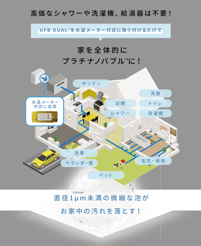 従来は各蛇口の水は普通の水道水だったけど、新仕様では、水道管の元にUFB装置を設置することで、家じゅうの水がウルトラファインバブル水に!